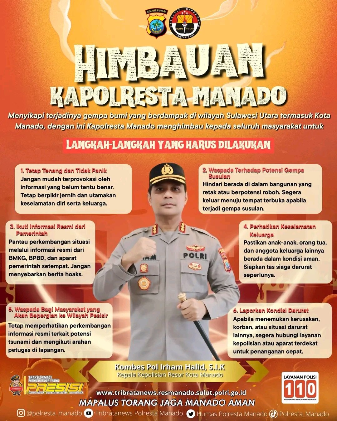 Lensanusantaranews || Manado – Menyikapi terjadinya gempa bumi yang berdampak di wilayah Sulawesi Utara termasuk Kota Manado Kamis (02/04/2026), dengan ini Kapolresta Manado Kombes Pol Irham Halid S.I.K menghimbau kepada seluruh masyarakat untuk: 1. Tetap Tenang dan Tidak Panik Jangan mudah terprovokasi oleh informasi yang belum tentu benar. Tetap berpikir jernih dan utamakan keselamatan diri serta keluarga. 2. Waspada Terhadap Potensi Gempa Susulan Hindari berada di dalam bangunan yang retak atau berpotensi roboh. Segera keluar menuju tempat terbuka apabila terjadi gempa susulan. 3. Ikuti Informasi Resmi dari Pemerintah Pantau perkembangan situasi melalui informasi resmi dari BMKG, BPBD, dan aparat pemerintah setempat. Jangan menyebarkan berita hoaks. 4. Perhatikan Keselamatan Keluarga Pastikan anak-anak, orang tua, dan anggota keluarga lainnya berada dalam kondisi aman. Siapkan tas siaga darurat seperlunya. 5. Waspada Bagi Masyarakat yang Akan Bepergian ke Wilayah Pesisir Tetap memperhatikan perkembangan informasi resmi terkait potensi tsunami dan mengikuti arahan petugas di lapangan. 6. Laporkan Kondisi Darurat Apabila menemukan kerusakan, korban, atau situasi darurat lainnya, segera hubungi layanan kepolisian atau aparat terdekat untuk penanganan cepat. Polresta Manado bersama TNI, Pemerintah Daerah, dan instansi terkait siap siaga memantau perkembangan situasi serta memberikan pelayanan terbaik demi keselamatan masyarakat. Mari kita bersama-sama menjaga ketertiban, saling membantu, dan tetap berdoa agar Kota Manado senantiasa dalam lindungan Tuhan Yang Maha Esa. Sumber: FB Polresta Manado Editor: (ianRZ) Berita ini dibaca : 19 Navigasi pos Gempa Magnitudo 7,6 Guncang Sulut – Maluku, Akibatkan Satu Korban Jiwa di Manado